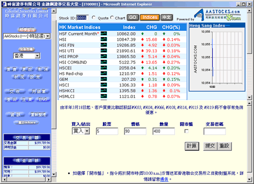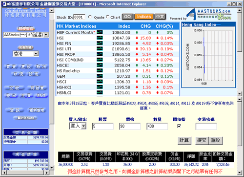 | 2. | 按"计算"将可获知阁下欲买卖指令之"总额"、"交易徵费"、"交易费"、"印花税"、"股票交收费"、"佣金"、"净额"、"按金比率"、"扣除交易金额"。 |
