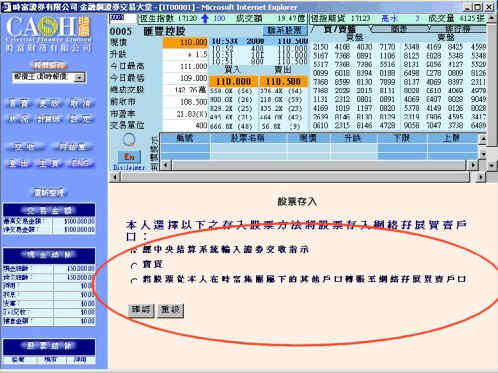| 登入后,按"交收",然后按"股票存入"。 选择股票市场及股票存入方式: |