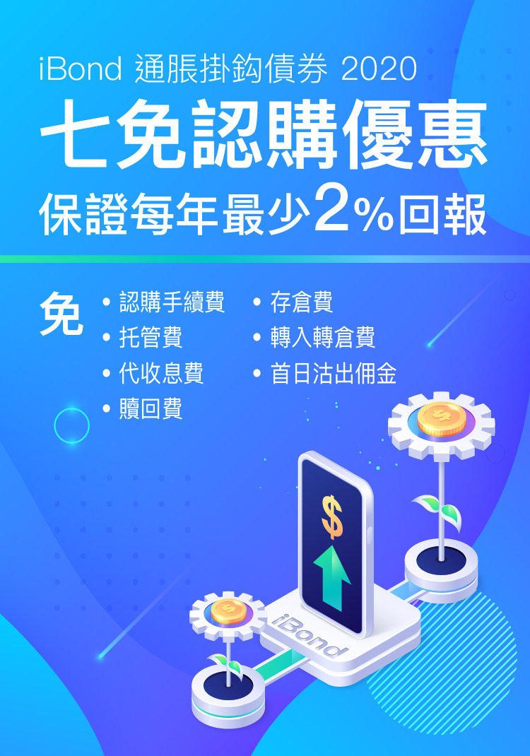 2. 七免費用為:認購手續費、托管費、代收息費、贖回費、存倉費、轉入轉倉費及豁免首日市場沽出佣金(僅限透過時富金融電子渠道申請認購獲分配之iBond,由客戶經理處理之戶口不獲免首日沽出佣金)。