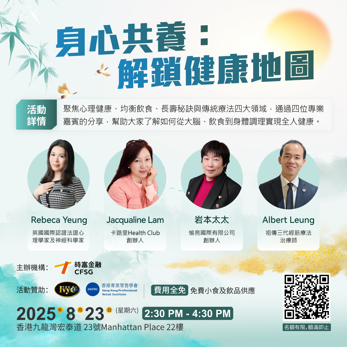 健康是人生最珍貴的財富,時富金融誠邀您參與「身心共養」健康講座,與四大專家攜手,從心理健康、均衡飲食、傳統療法等方面分享健康生活的秘訣,助您保持身心最佳狀態,健康與財富同步增值。
