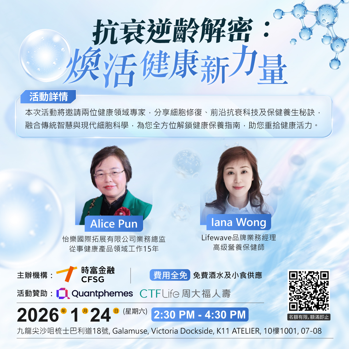 本次活動特別邀請兩位健康領域專家,深度拆解細胞修復奧秘、前沿抗衰科技成果,分享實用保健秘訣。傳統養生智慧結合現代細胞科學,助您開啟逆齡健康之旅!
