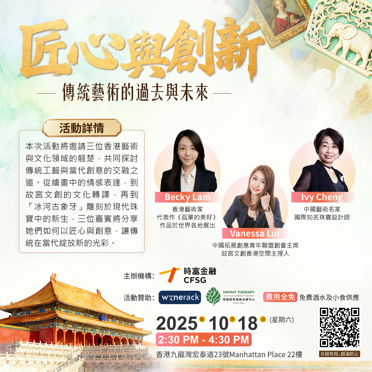 時富金融誠邀您共赴一場文化與靈感的盛宴!「匠心與創新:傳統藝術的過去與未來」主題活動,匯聚三位香港藝術與文化領域翹楚,深入探討繪畫情感表達、故宮文創文化的現代轉譯,以及傳統工藝在現代珠寶設計中的新生風采。讓您在匠心與創意的交融中,領略文化傳承與創新融合的獨特韻味。